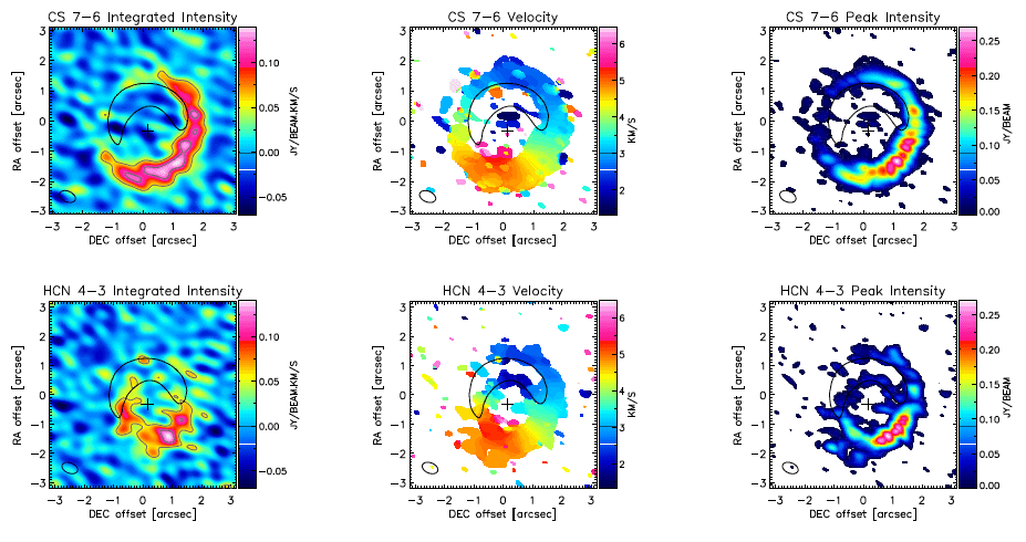 to explain the decrease under the horseshoe-shaped continuum are [1] the increased opacity coming from the higher dust concentration at the continuum peak; [2] Lower dust temperatures associated with a locally increased average grain size and/or [3] an optically thick radio-continuum reduce line emission by freeze-out and shielding of emission from the far side of the disk.